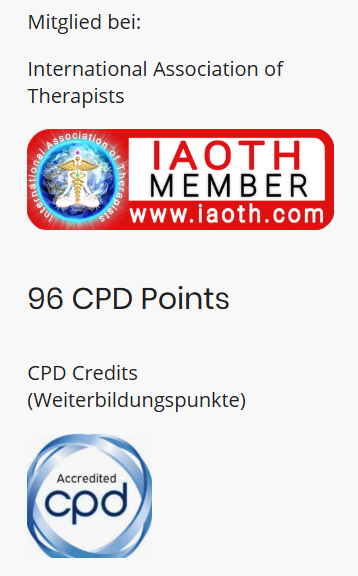 Ich bin aktives Mitglied der International Association of Therapists (IAOTH). Meine Qualifikationen und der von mir vermittelte Lernstoff werden dort regelmäßig geprüft. Zusätzlich bestätigten 96 anerkannte CPD-Punkte meine kontinuierliche, hochwertige Weiterbildung – ein Zeichen für professionelle Expertise und höchste Qualitätsstandards.